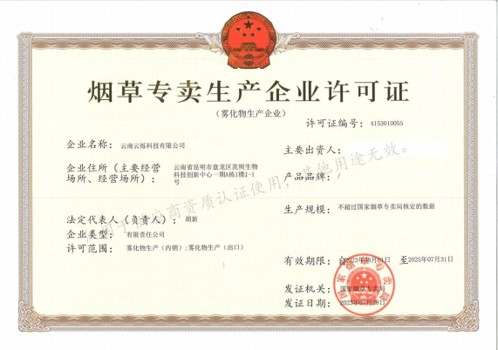 首页 > 荣誉资质 > 烟草专卖生产企业许可证(雾化物生产企业) Tobacco monopoly production enterprise license (E-liquid enterprise)